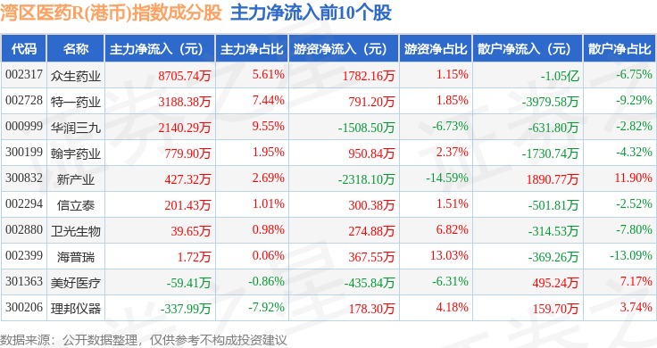 资金流向方面,湾区医药R(港币)(480014)指数成份股当日主力资金净流出合计823.62万元,游资资金净流出合计2157.76万元,散户资金净流入合计2981.38万元。成份股资金流向详情见下表: