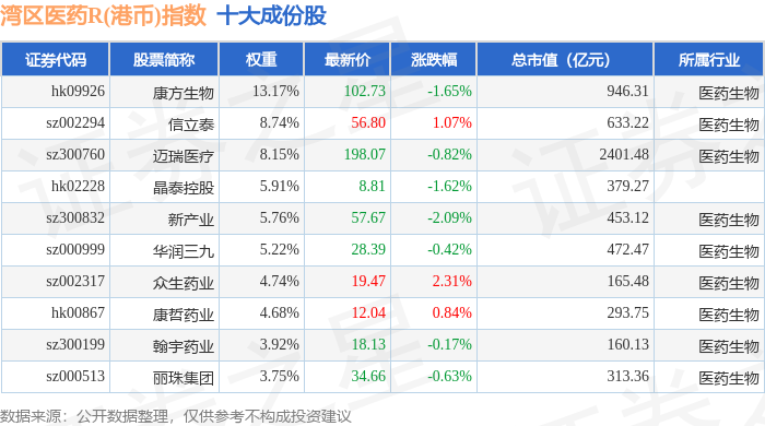 湾区医药R(港币)(480014)指数十大成份股详情如下:
