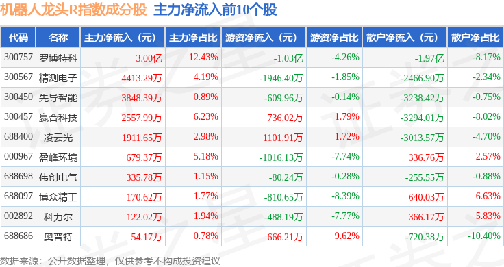 资金流向方面,机器人龙头R(480071)指数成份股当日主力资金净流出合计8.58亿元,游资资金净流入合计1708.51万元,散户资金净流入合计8.41亿元。成份股资金流向详情见下表: