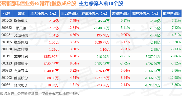 资金流向方面,深港通电信业务R(港币)(483030)指数成份股当日主力资金净流出合计41.35亿元,游资资金净流入合计20.0亿元,散户资金净流入合计21.35亿元。成份股资金流向详情见下表: