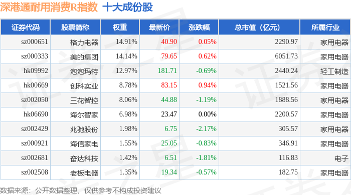 深港通耐用消费R(483049)指数十大成份股详情如下: