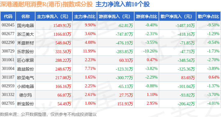 资金流向方面,深港通耐用消费R(港币)(483050)指数成份股当日主力资金净流出合计14.72亿元,游资资金净流入合计1.98亿元,散户资金净流入合计12.73亿元。成份股资金流向详情见下表: