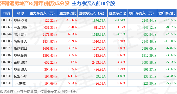资金流向方面,深港通房地产R(港币)(483072)指数成份股当日主力资金净流出合计4.29亿元,游资资金净流入合计1.74亿元,散户资金净流入合计2.55亿元。成份股资金流向详情见下表: