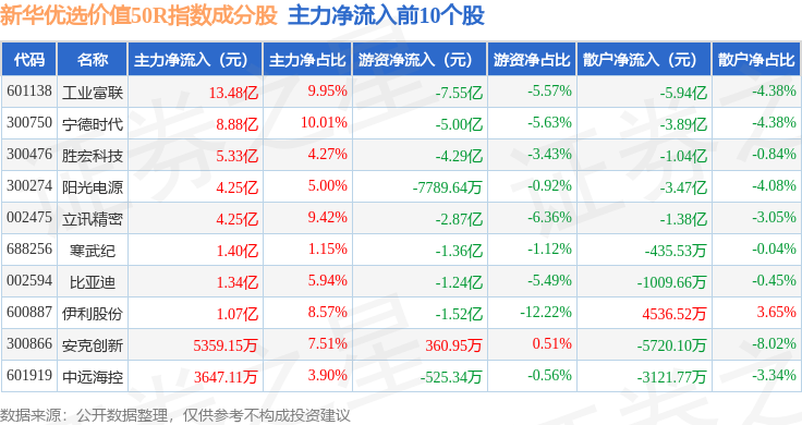 资金流向方面,新华优选价值50R(489004)指数成份股当日主力资金净流出合计15.47亿元,游资资金净流入合计1.17亿元,散户资金净流入合计14.3亿元。成份股资金流向详情见下表: