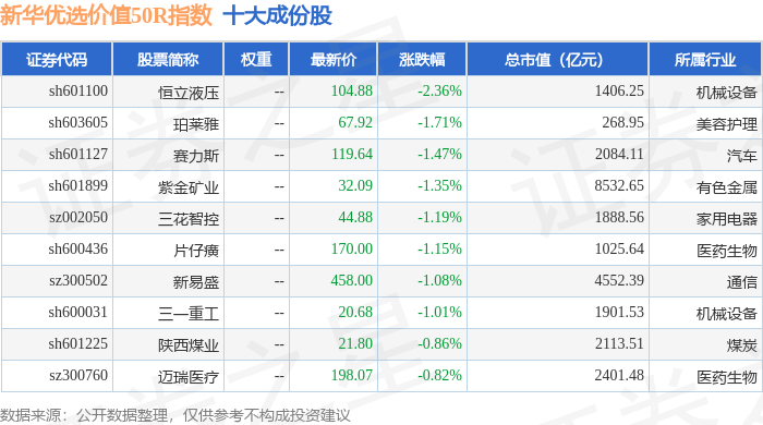 新华优选价值50R(489004)指数十大成份股详情如下: