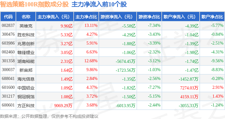 资金流向方面,智选策略100R(489015)指数成份股当日主力资金净流出合计17.35亿元,游资资金净流入合计7384.82万元,散户资金净流入合计16.61亿元。成份股资金流向详情见下表: