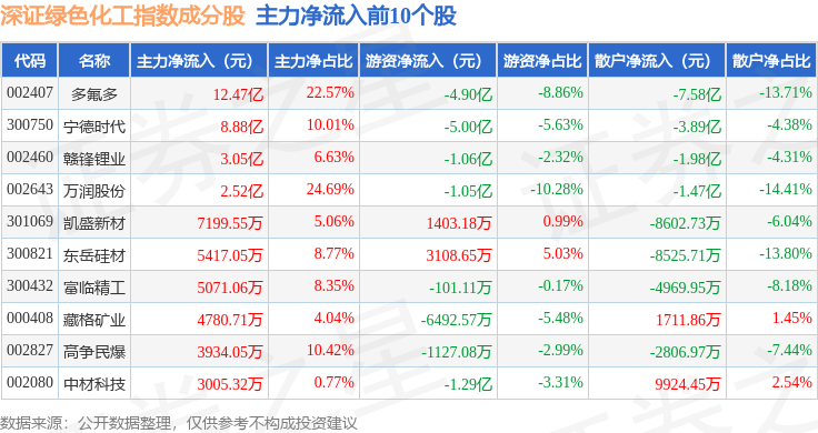 资金流向方面,深证绿色化工(970076)指数成份股当日主力资金净流入合计24.25亿元,游资资金净流出合计14.72亿元,散户资金净流出合计9.53亿元。成份股资金流向详情见下表: