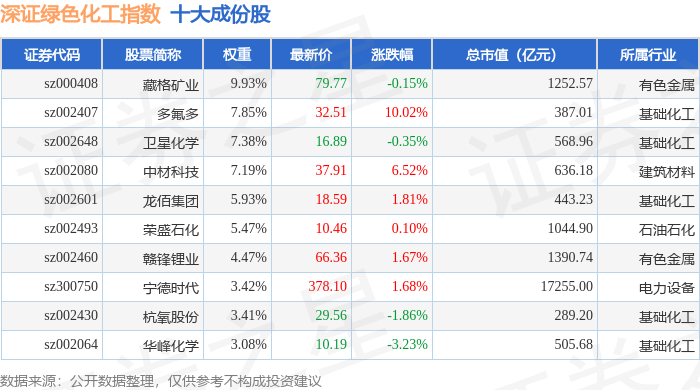 证券之星消息,12月23日,深证绿色化工(970076)指数报收于1710.8点,涨1.28%,成交409.63亿元,换手率1.93%。当日该指数成份股中,上涨的有28家,多氟多以10.02%的涨幅领涨,下跌的有22家,华峰化学以3.23%的跌幅领跌。