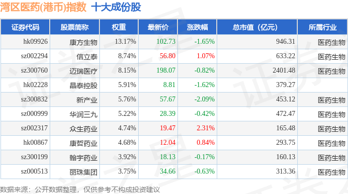 湾区医药(港币)(980014)指数十大成份股详情如下: