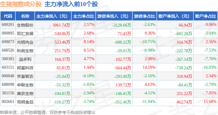 资金流向方面,生猪指数(980073)成份股当日主力资金净流出合计7.45亿元,游资资金净流入合计1.84亿元,散户资金净流入合计5.61亿元。成份股资金流向详情见下表: