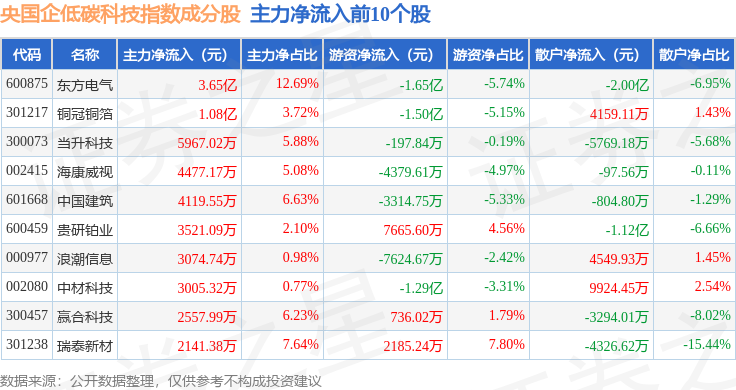 资金流向方面,央国企低碳科技(980082)指数成份股当日主力资金净流出合计6656.79万元,游资资金净流出合计3.31亿元,散户资金净流入合计3.98亿元。成份股资金流向详情见下表: