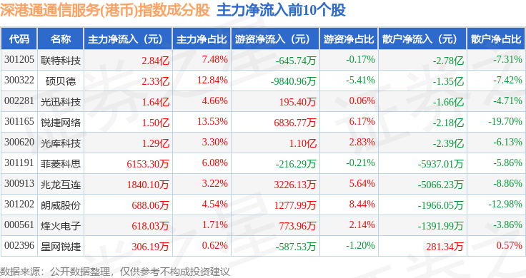 资金流向方面,深港通通信服务(港币)(983034)指数成份股当日主力资金净流出合计40.86亿元,游资资金净流入合计20.13亿元,散户资金净流入合计20.72亿元。成份股资金流向详情见下表: