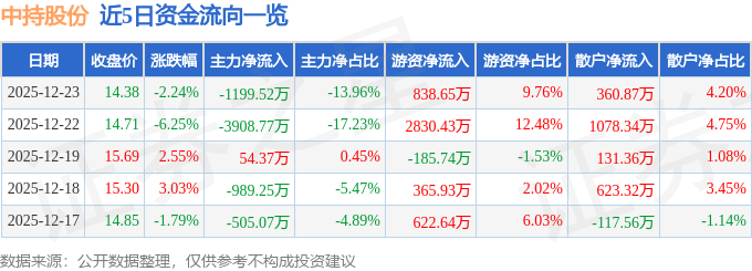 12月23日的资金流向数据方面,主力资金净流出1199.52万元,占总成交额13.96%,游资资金净流入838.65万元,占总成交额9.76%,散户资金净流入360.87万元,占总成交额4.2%。