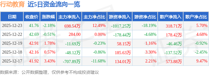 证券之星消息,截至2025年12月23日收盘,行动教育(605098)报收于41.76元,下跌2.18%,换手率1.12%,成交量1.34万手,成交额5592.49万元。