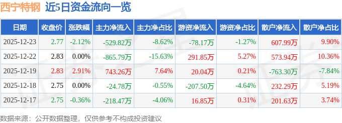证券之星消息,截至2025年12月23日收盘,西宁特钢(600117)报收于2.77元,下跌2.12%,换手率0.68%,成交量22.07万手,成交额6143.26万元。