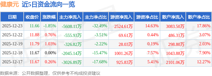 证券之星消息,截至2025年12月23日收盘,健康元(600380)报收于11.66元,下跌1.85%,换手率0.8%,成交量14.71万手,成交额1.73亿元。