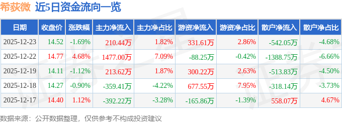证券之星消息,截至2025年12月23日收盘,希荻微(688173)报收于14.52元,下跌1.69%,换手率1.95%,成交量7.95万手,成交额1.16亿元。