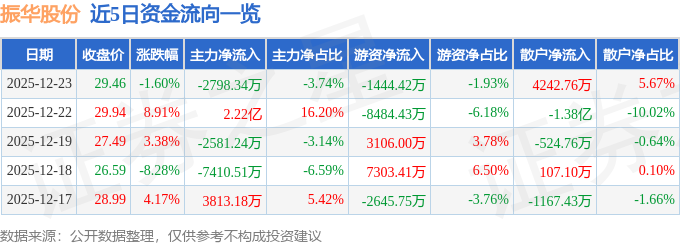 证券之星消息,截至2025年12月23日收盘,振华股份(603067)报收于29.46元,下跌1.6%,换手率3.56%,成交量25.33万手,成交额7.48亿元。