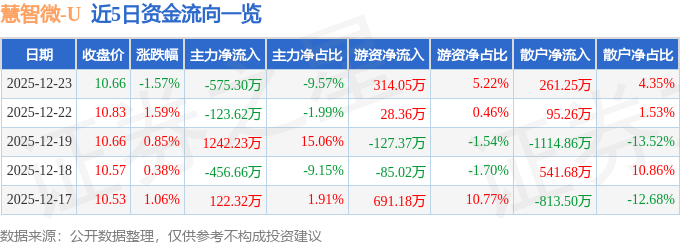 证券之星消息,截至2025年12月23日收盘,慧智微(688512)报收于10.66元,下跌1.57%,换手率1.73%,成交量5.6万手,成交额6010.95万元。