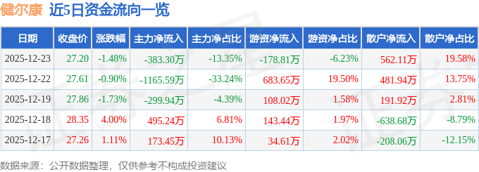 证券之星消息,截至2025年12月23日收盘,健尔康(603205)报收于27.2元,下跌1.48%,换手率2.54%,成交量1.05万手,成交额2870.15万元。