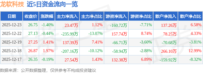 12月23日的资金流向数据方面,主力资金净流入23.47万元,占总成交额1.12%,游资资金净流出160.72万元,占总成交额7.71%,散户资金净流入137.26万元,占总成交额6.58%。
