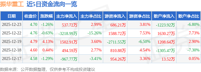证券之星消息,截至2025年12月23日收盘,振华重工(600320)报收于4.7元,下跌1.26%,换手率1.15%,成交量38.21万手,成交额1.8亿元。
