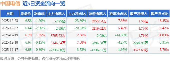 证券之星消息,截至2025年12月23日收盘,中国电信(601728)报收于6.56元,下跌1.2%,换手率0.18%,成交量143.25万手,成交额9.46亿元。