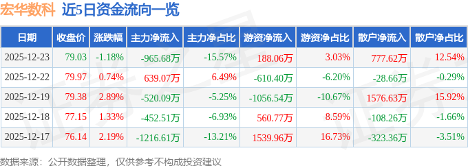 证券之星消息,截至2025年12月23日收盘,宏华数科(688789)报收于79.03元,下跌1.18%,换手率0.43%,成交量7790.0手,成交额6202.5万元。