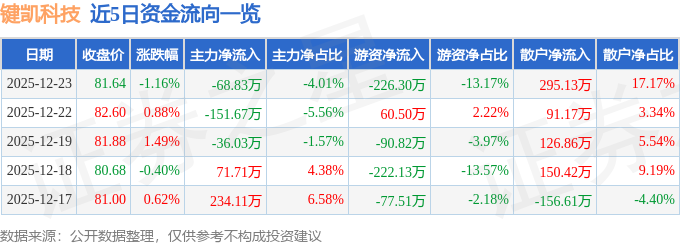 证券之星消息,截至2025年12月23日收盘,键凯科技(688356)报收于81.64元,下跌1.16%,换手率0.35%,成交量2098.0手,成交额1718.38万元。