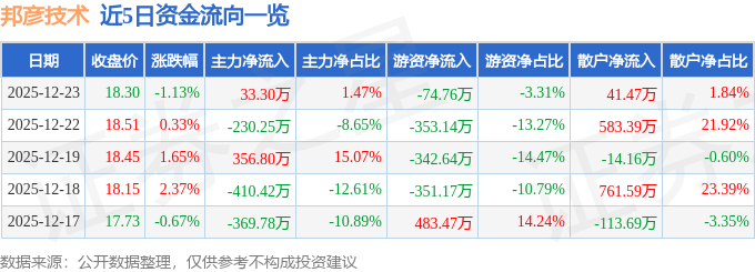证券之星消息,截至2025年12月23日收盘,邦彦技术(688132)报收于18.3元,下跌1.13%,换手率1.13%,成交量1.22万手,成交额2259.65万元。