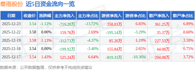 证券之星消息,截至2025年12月23日收盘,秦港股份(601326)报收于3.54元,下跌1.12%,换手率0.31%,成交量14.75万手,成交额5244.36万元。