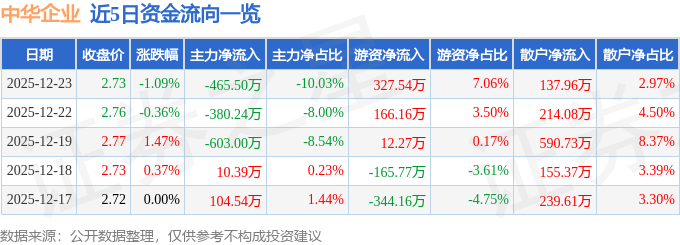 证券之星消息,截至2025年12月23日收盘,中华企业(600675)报收于2.73元,下跌1.09%,换手率0.28%,成交量16.95万手,成交额4641.87万元。