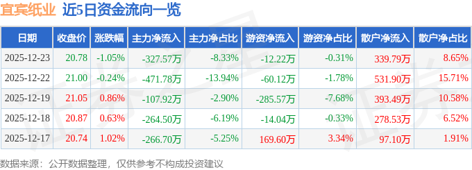 证券之星消息,截至2025年12月23日收盘,宜宾纸业(600793)报收于20.78元,下跌1.05%,换手率1.07%,成交量1.89万手,成交额3930.31万元。