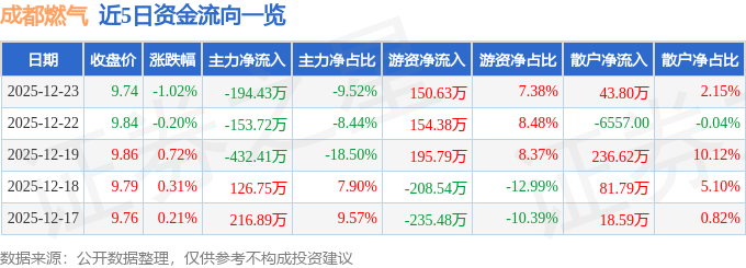 证券之星消息,截至2025年12月23日收盘,成都燃气(603053)报收于9.74元,下跌1.02%,换手率0.24%,成交量2.09万手,成交额2041.86万元。