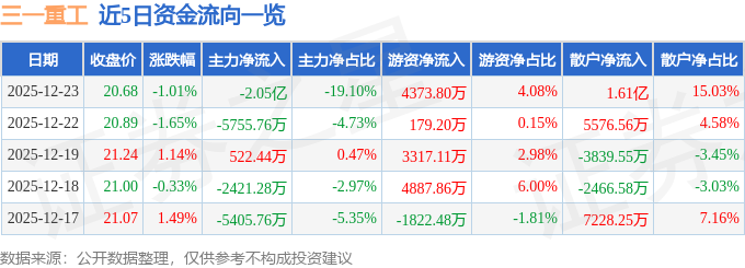 证券之星消息,截至2025年12月23日收盘,三一重工(600031)报收于20.68元,下跌1.01%,换手率0.61%,成交量52.01万手,成交额10.73亿元。