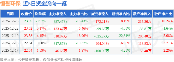 证券之星消息,截至2025年12月23日收盘,恒誉环保(688309)报收于23.39元,下跌0.97%,换手率1.13%,成交量8979.0手,成交额2102.03万元。