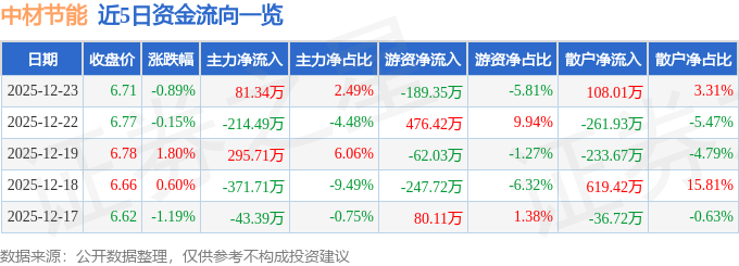 证券之星消息,截至2025年12月23日收盘,中材节能(603126)报收于6.71元,下跌0.89%,换手率0.8%,成交量4.86万手,成交额3261.52万元。