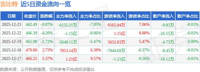 证券之星消息,截至2025年12月23日收盘,吉比特(603444)报收于442.49元,下跌0.87%,换手率2.74%,成交量1.98万手,成交额8.73亿元。