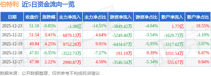 12月23日的资金流向数据方面,主力资金净流出1.38亿元,占总成交额14.51%,游资资金净流出3849.42万元,占总成交额4.04%,散户资金净流入1.77亿元,占总成交额18.55%。