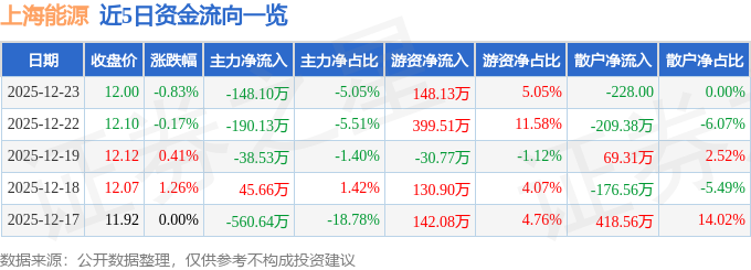 证券之星消息,截至2025年12月23日收盘,上海能源(600508)报收于12.0元,下跌0.83%,换手率0.34%,成交量2.43万手,成交额2930.48万元。