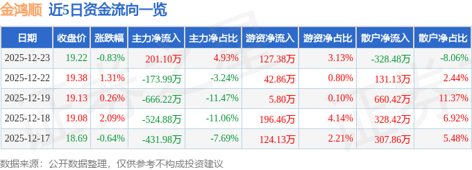 证券之星消息,截至2025年12月23日收盘,金鸿顺(603922)报收于19.22元,下跌0.83%,换手率1.18%,成交量2.12万手,成交额4075.54万元。
