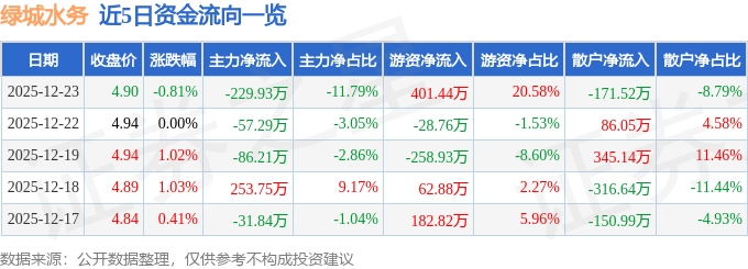 证券之星消息,截至2025年12月23日收盘,绿城水务(601368)报收于4.9元,下跌0.81%,换手率0.45%,成交量3.98万手,成交额1950.8万元。