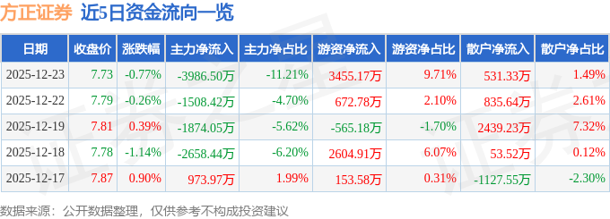 证券之星消息,截至2025年12月23日收盘,方正证券(601901)报收于7.73元,下跌0.77%,换手率0.56%,成交量45.82万手,成交额3.56亿元。