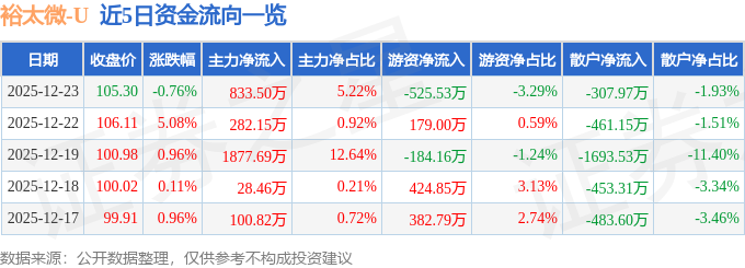 证券之星消息,截至2025年12月23日收盘,裕太微(688515)报收于105.3元,下跌0.76%,换手率3.05%,成交量1.52万手,成交额1.6亿元。