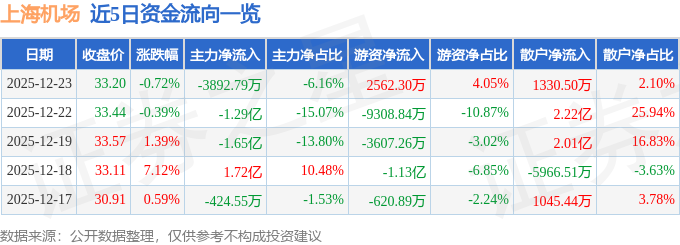 证券之星消息,截至2025年12月23日收盘,上海机场(600009)报收于33.2元,下跌0.72%,换手率0.93%,成交量18.98万手,成交额6.32亿元。