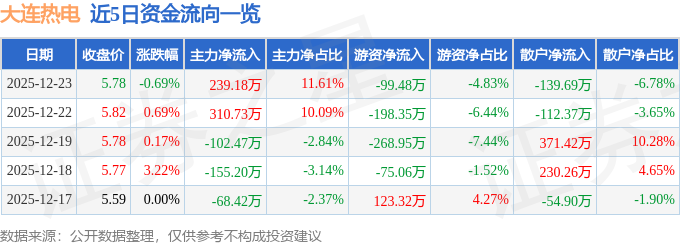 证券之星消息,截至2025年12月23日收盘,大连热电(600719)报收于5.78元,下跌0.69%,换手率0.88%,成交量3.57万手,成交额2060.04万元。
