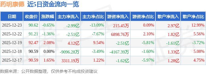 证券之星消息,截至2025年12月23日收盘,药明康德(603259)报收于90.62元,下跌0.65%,换手率1.02%,成交量25.13万手,成交额22.86亿元。