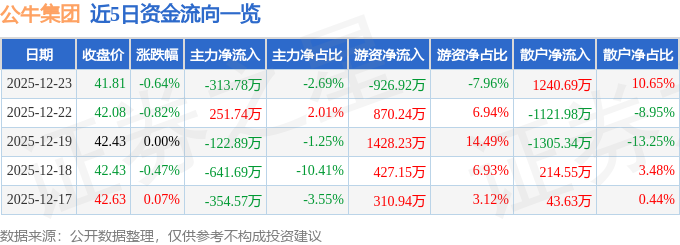 证券之星消息,截至2025年12月23日收盘,公牛集团(603195)报收于41.81元,下跌0.64%,换手率0.15%,成交量2.78万手,成交额1.16亿元。