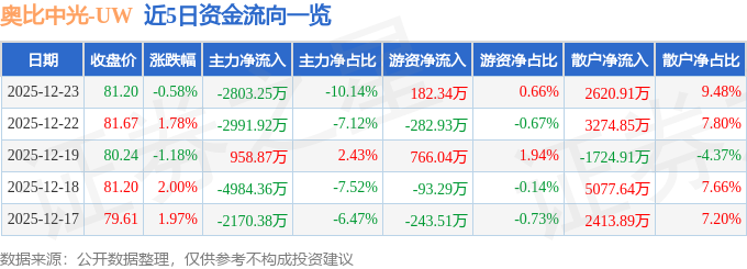 证券之星消息,截至2025年12月23日收盘,奥比中光(688322)报收于81.2元,下跌0.58%,换手率1.16%,成交量3.4万手,成交额2.77亿元。