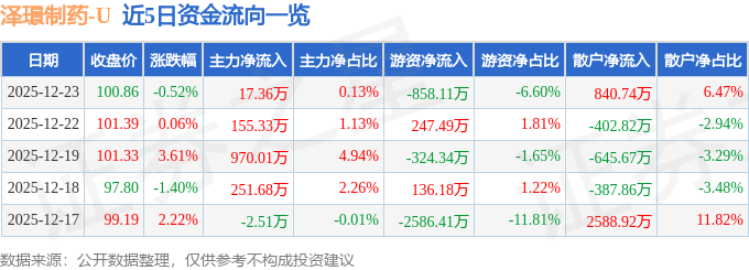 证券之星消息,截至2025年12月23日收盘,泽璟制药(688266)报收于100.86元,下跌0.52%,换手率0.48%,成交量1.28万手,成交额1.3亿元。